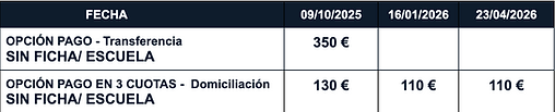 Tres cuotas - Domiciliación. (obligatorio mandar el certificado de titularidad de cuenta solo si eres nuevo en la actividad, si eres jugador antiguo se te mantendrá el número de cuenta antiguo a no ser que nos indiques lo contrario)